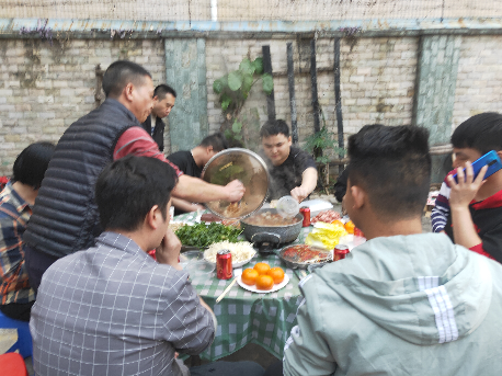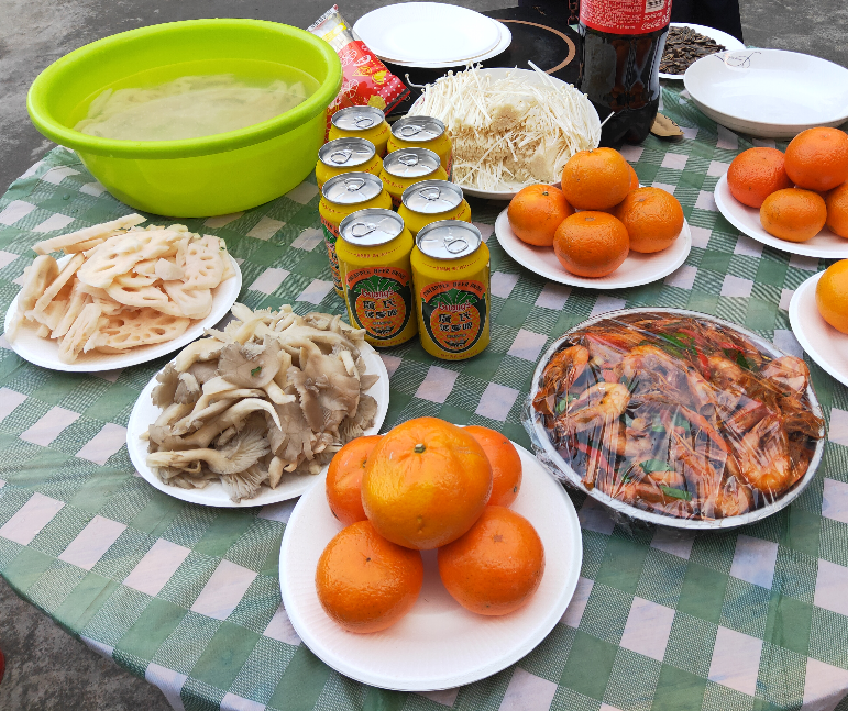游戲做完,就到了大家最期待的大餐了。在院子里支起幾張桌子,是不是有種吃席的感覺了呢?我們的食堂大師傅早已準(zhǔn)備好了食物,大家一人端幾個(gè),很快就擺滿了桌子。